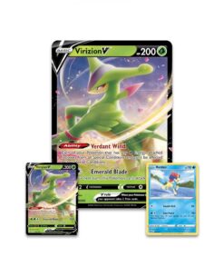 ¡Vuélvete ecológico y otorga justicia con el poder legendario de Virizion V! ¡Atiende a tus aliados con la habilidad Viento verde, luego pasa a la ofensiva para lanzar golpes poderosos con el ataque Espada esmeralda! En esta caja, encontrarás versiones jugables y de gran tamaño de Virizion V, además de una carta jugable adicional con Keldeo. También obtendrás un puñado de paquetes de refuerzo de Pokémon TCG para darle un impulso a tu baraja antes de tu próxima partida.