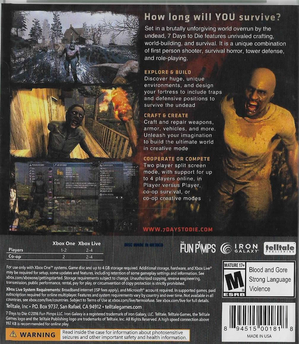 7 days to die ha redefinido el género de supervivencia, con artesanía sin igual y un contenido de construcción del mundo. Ambientado en un mundo post-apocalíptico que no perdona, invadido por los no-muertos , 7 días en morir es un juego de mundo abierto, es una combinación única de shooter en primera persona, de terror y supervivencia , la torre de defensa , y los juegos de rol . Presenta el combate , el saqueo , la minería , la exploración y el desarrollo del carácter , de una manera que ha dado una respuesta entusiasta de los aficionados de todo el mundo .