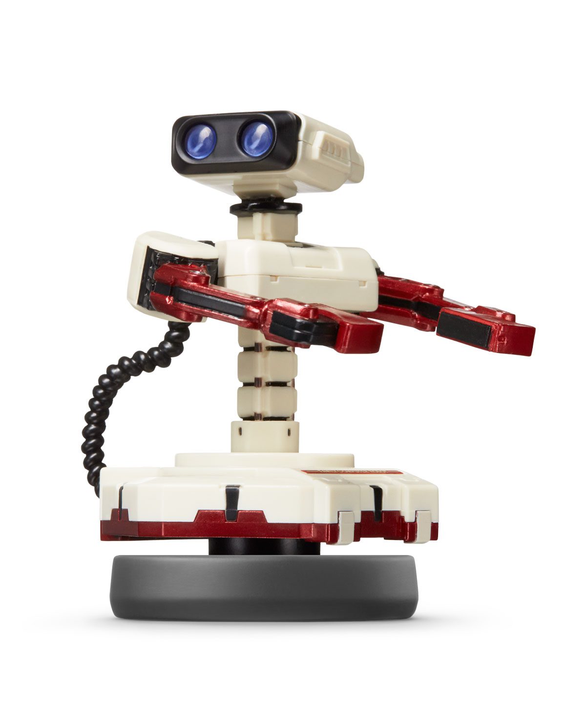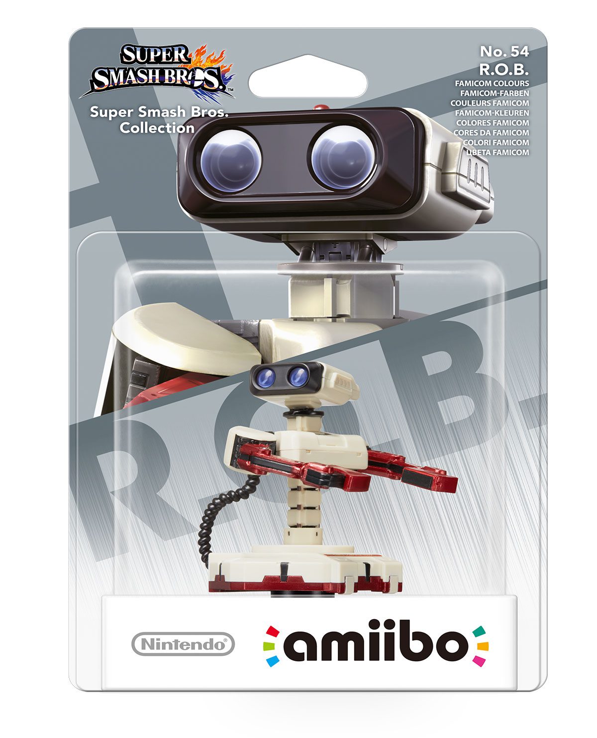 Amiibo de R.O.B. luciendo sus colores Famicom. Este compañero robótico fue lanzado en 1985 como accesorio para el Nintendo Entertainment System. R.O.B. Introdujo una nueva manera para que los jugadores interactuaran con los juegos. En los últimos años, R.O.B. apareció como un personaje jugable en varios juegos, incluyendo Super Smash Bros para Wii U y Nintendo 3DS, usando armas de proyectiles para atacar y una base de cohetes para volar por el aire.