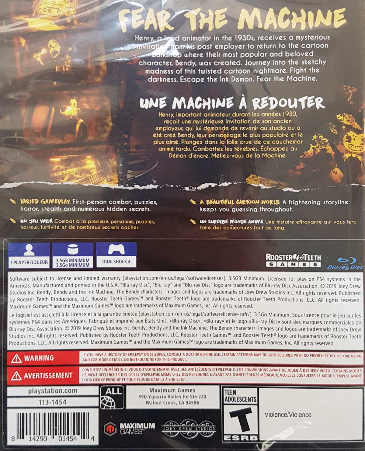 Bendy and the Ink Machine es un juego de acertijos y acción en primera persona que comienza en los lejanos días de la animación y termina en un futuro muy oscuro. Juega como Henry mientras vuelve a visitar los demonios de su pasado explorando el taller abandonado del animador de Joey Drew Studios . Con giros y vueltas en cada esquina, Bendy and the Ink Machine seguramente te emocionará… y diezmará tu infancia. Nunca verás los dibujos animados de la misma manera otra vez…