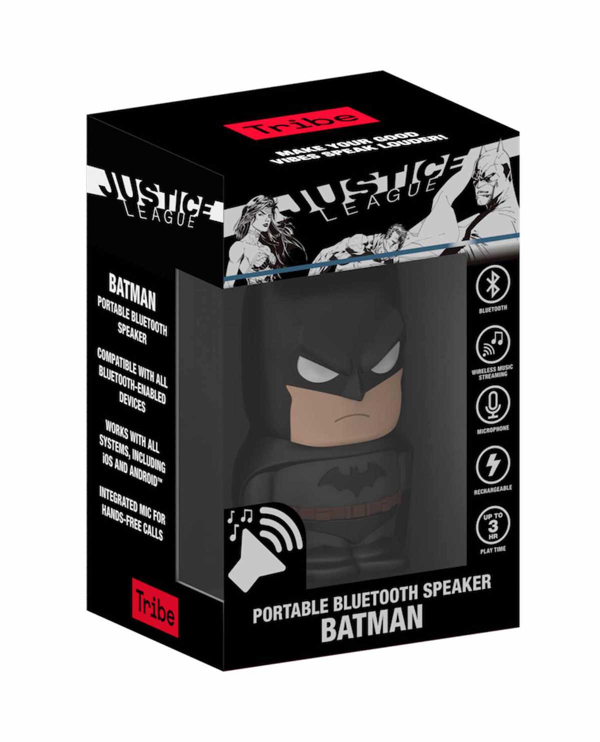Tribe nos presenta una nueva línea de productos, basados en el Universo DC. En este caso se trata de un altavoz bluetooth, basado en Batman. Es un altavoz para poder escuchar música, además incluye micrófono y botón para llamadas de manos libres. Mide 60x44x90mm, tiene una distancia de operación de 10 m y dura hasta 4 horas. Tiene una potencia de salida de 2W y una batería de Li-Polymer.
