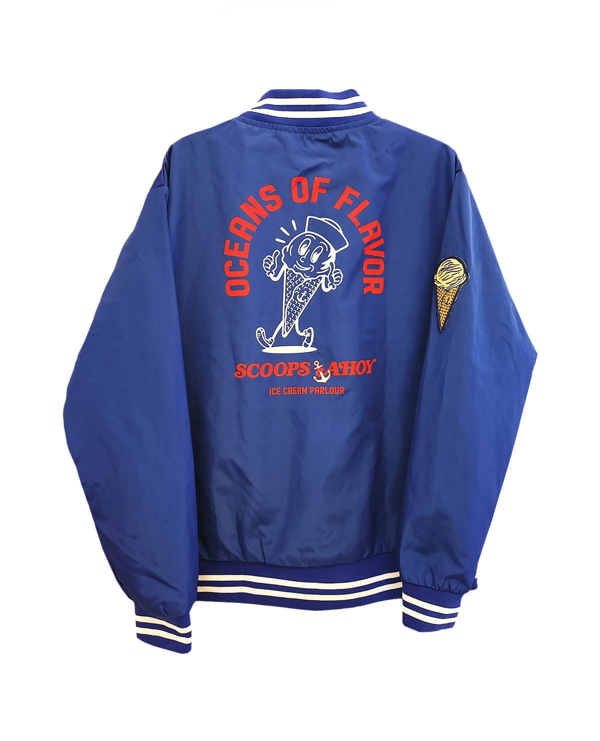 Con un diseño que hace alusión al uniforme clásico de la heladería favorita de Hawkins, esta chaqueta presenta una ilustración en la espalda que rinde homenaje al icónico Scoops Ahoy.