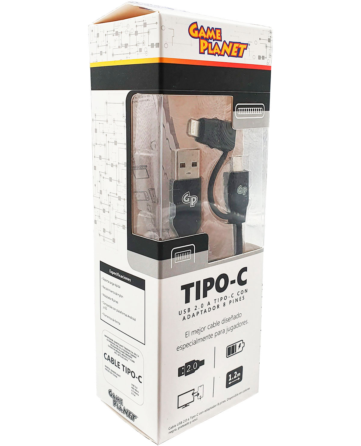 CABLE USB TIPO C CON ADAPTADOR 8 PIN NEGRO 1.2M