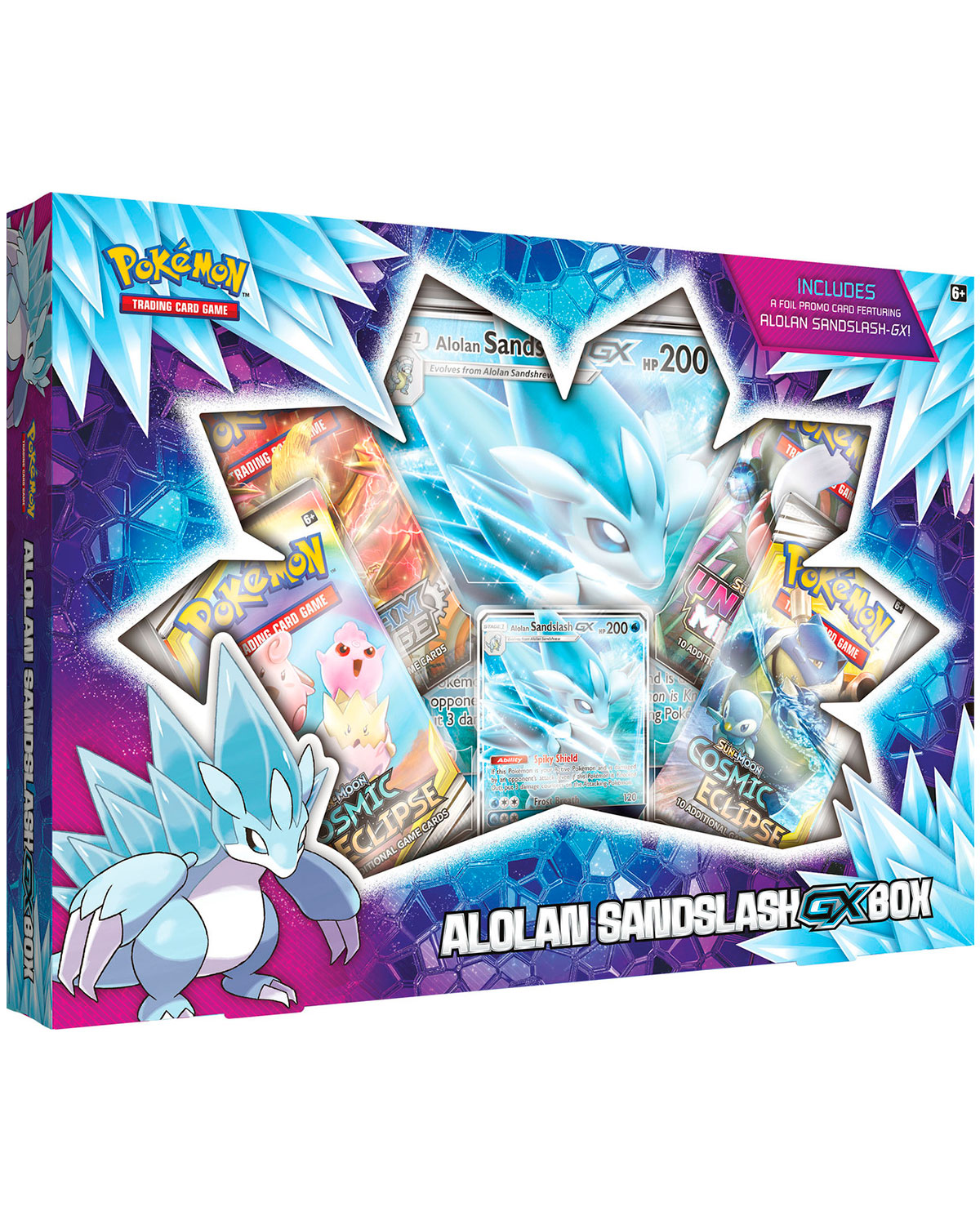 Desde el calor de Alola, llega un gélido contrincante con rápidas garras y puntiagudas púas azules: ¡Sandslash de Alola-GX! La colección Sandslash de Alola-GX del Juego de Cartas Coleccionables Pokémon incorpora a este peligroso Pokémon y su poder glacial con versiones holográficas tanto para jugar como en tamaño gigante. ¡Ponte en marcha con un poder tranquilo y constante añadiendo a Sandslash de Alola-GX a tu colección de JCC Pokémon!