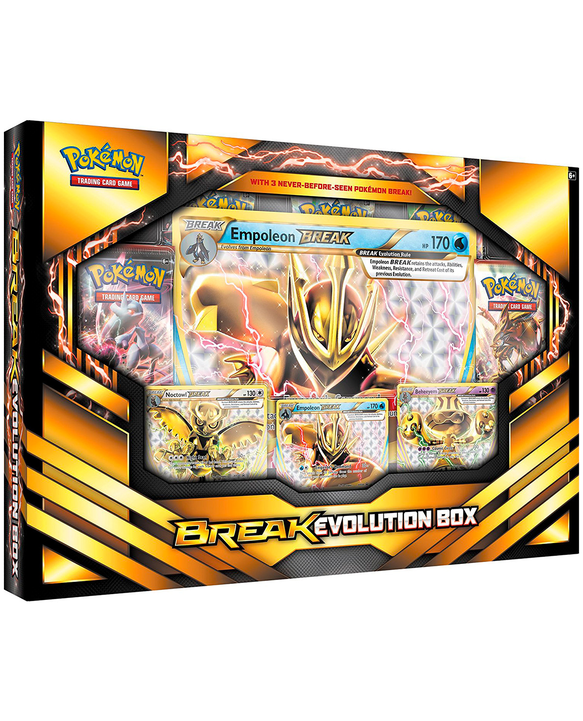 Rompe lo extraodinario! Break Evolution es la más nueva manera de equipar y hacer más poderosos a tus Pokémon, esta caja contiene no 1 si no 3 nuevos Pokémon Break, más una carta especial de gran tamaño y 5 Booster packs para que expandas tu colección. Haz una ruptura por la victoria con el TCG de Pokémon: Break Evolution!!