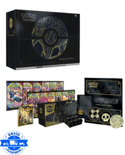 Hay dos versiones diferentes de este conjunto, cada una centrada en uno de los Pokémon Guerreros legendarios de la región de Galar. Cuando elijas un conjunto, obtendrás una carta especial en dorada con Zacian V o Zamazenta V. También encontrarás 65 fundas de cartas con el Pokémon estrella de ese conjunto.