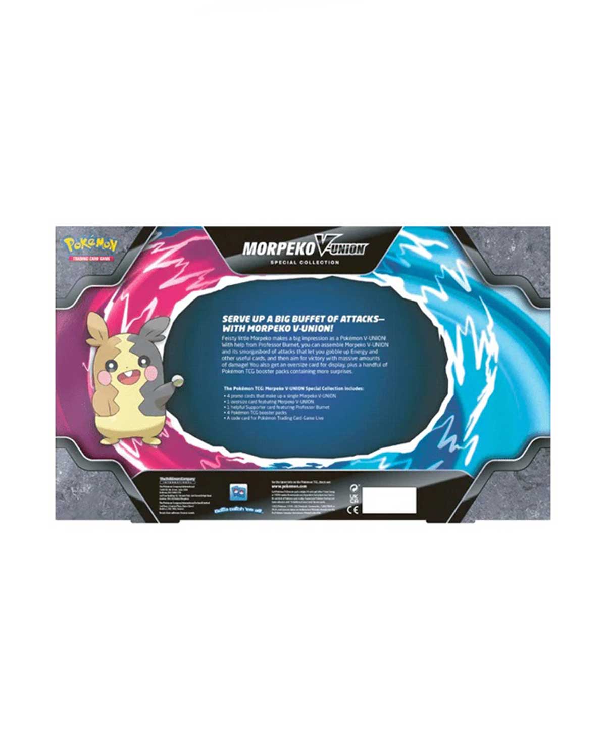 ¡El pequeño y luchador Morpeko causa una gran impresión como un Pokémon V-UNION! Con la ayuda del profesor Burnet, puedes construir Morpeko V-UNION y su conjunto de ataques que te permiten engullir energía y otras cartas útiles, ¡y luego apuntar a la victoria con enormes cantidades de daño! También obtienes una tarjeta de gran tamaño para exhibir, además de un puñado de paquetes de mejora de Pokémon TCG con aún más sorpresas.