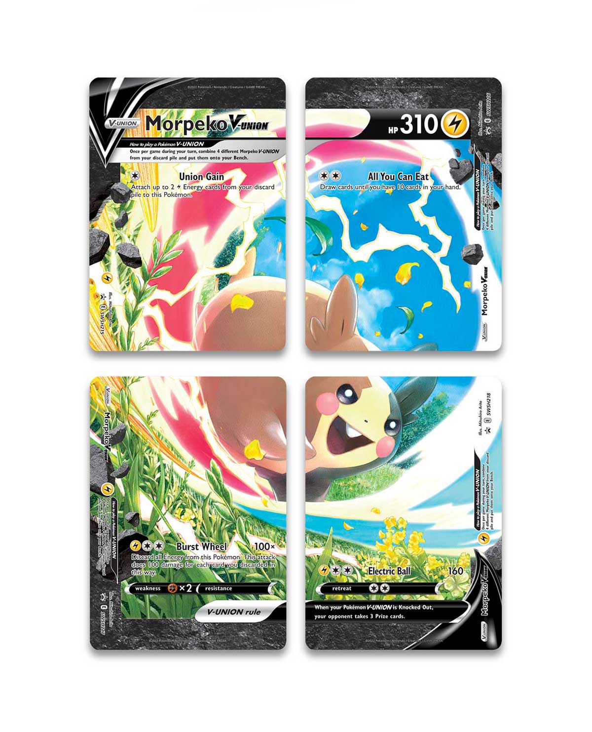 4 cartas promocionales que juntas hacen un Morpeko V-UNION
