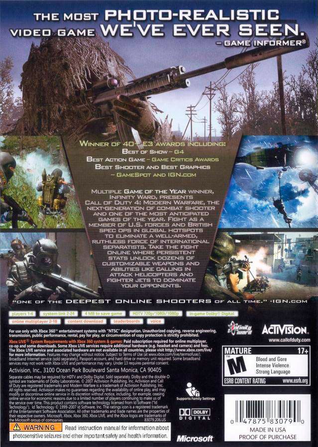 Call Of Duty 4 es una verdadera joya del genero, desde su pulido apartado grafico hasta el sonoro realmente evocan el sentimiento de un campo de batalla actual, cada clase de soldado cuenta con su propio armamento, los especialistas de tiro usan los silenciosos pero eficaces snipers, mientras los médicos cruzan las barricadas con su fiel escopeta para levantar a sus aliados heridos.