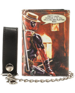 Esta cartera viene con el símbolo que representa a Deadpool como super héroe, mientras en la parte traserá viene este irreverante hombre en una pose seductora con una frase elocuente, esta cartera viene con una cadena para que puedas protegerla de robos.