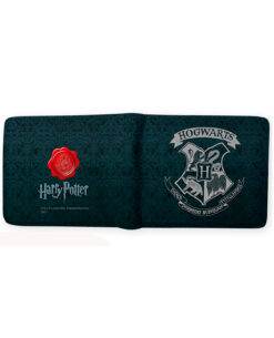 La cartera es negra y viene con el logo de la escuela más famosa de brujería que existe en el mundo, pero no es lo único fascinante de este artilugio, por dentro podrás guardar credenciales, billetes y galeones en una forma perfectamente organizada, pero lo mejor es que en esta cartea en la parte de atrás podrás observar el sello de cera que venía cuando leíste que habías sido aceptado en Hogwarts.