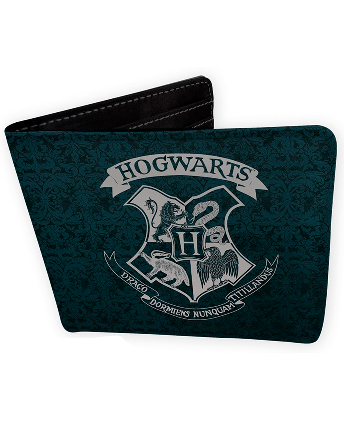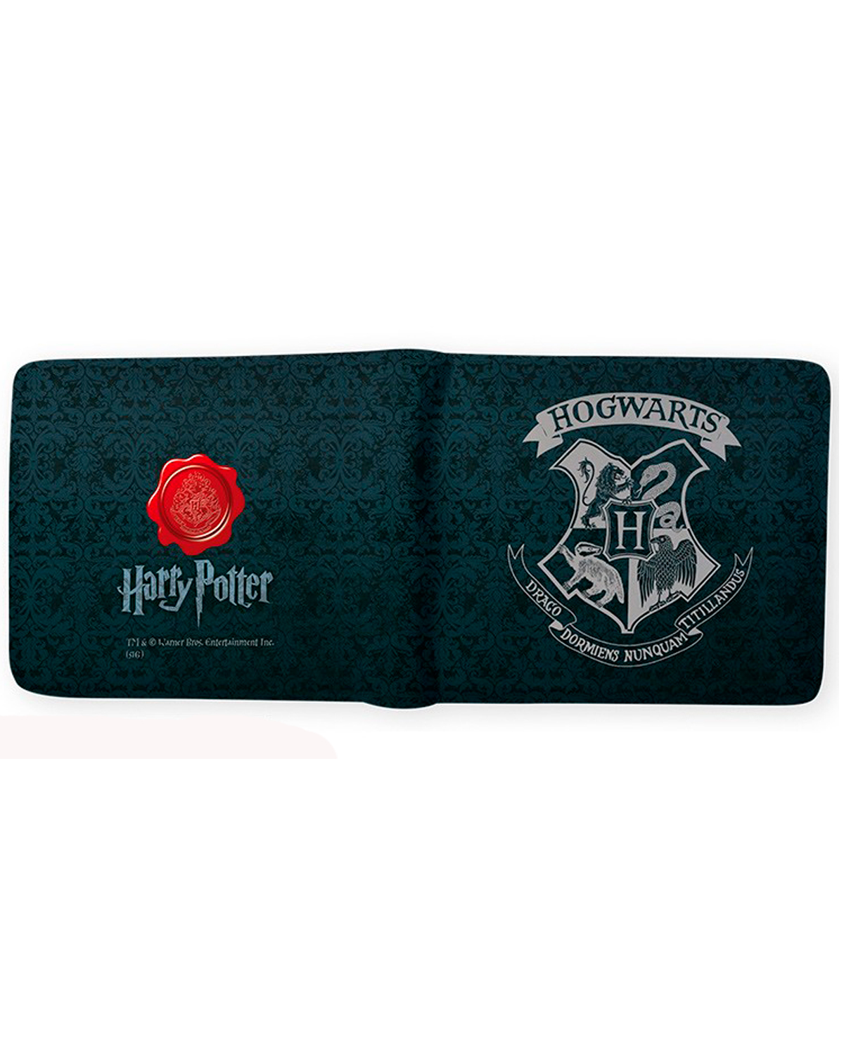 La cartera es negra y viene con el logo de la escuela más famosa de brujería que existe en el mundo, pero no es lo único fascinante de este artilugio, por dentro podrás guardar credenciales, billetes y galeones en una forma perfectamente organizada, pero lo mejor es que en esta cartea en la parte de atrás podrás observar el sello de cera que venía cuando leíste que habías sido aceptado en Hogwarts.