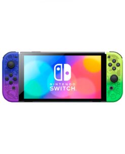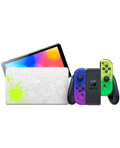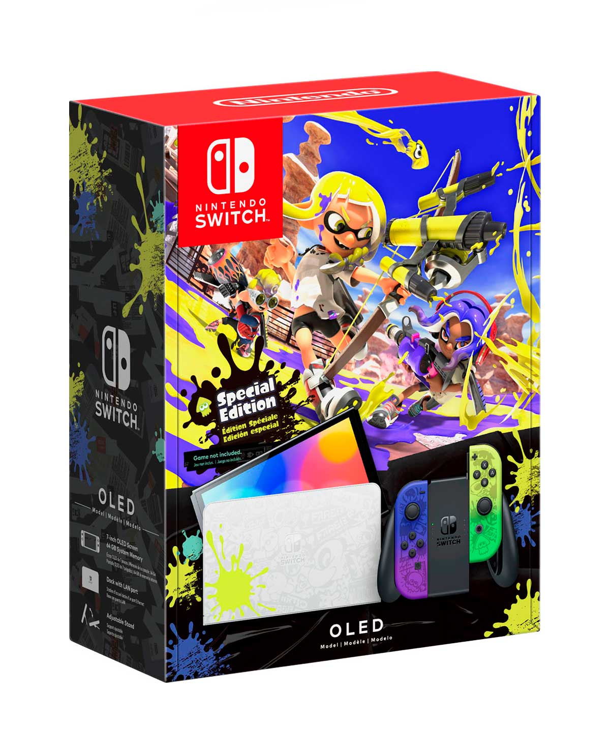 - Controles Joy-Con degradados en azul y amarillo con una parte inferior blanca, una base blanca adornada con graffiti y un diseño splat-tástico en la parte posterior del sistema.