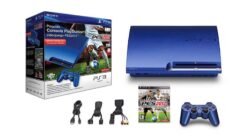 Paquete limitado que contiene una consola Playstation 3 color azul metálico y el videojuego Pro Evolution Soccer 2012.