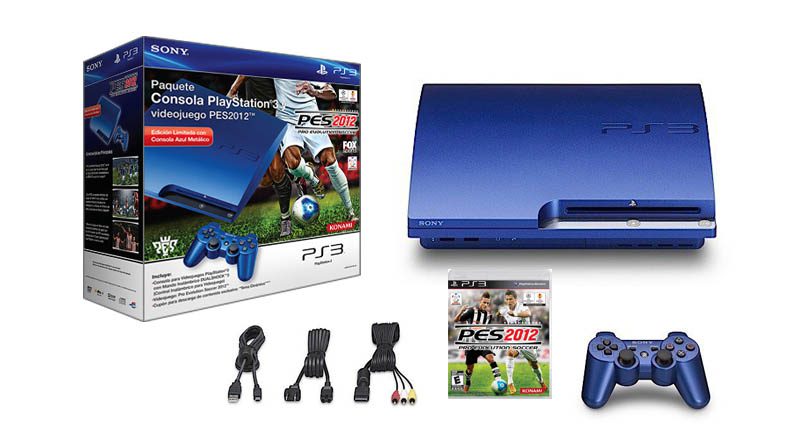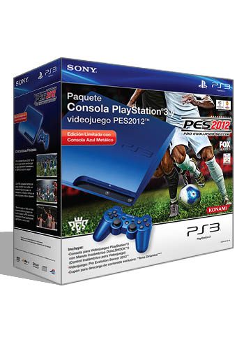 Paquete limitado que contiene una consola Playstation 3 color azul metálico y el videojuego Pro Evolution Soccer 2012.