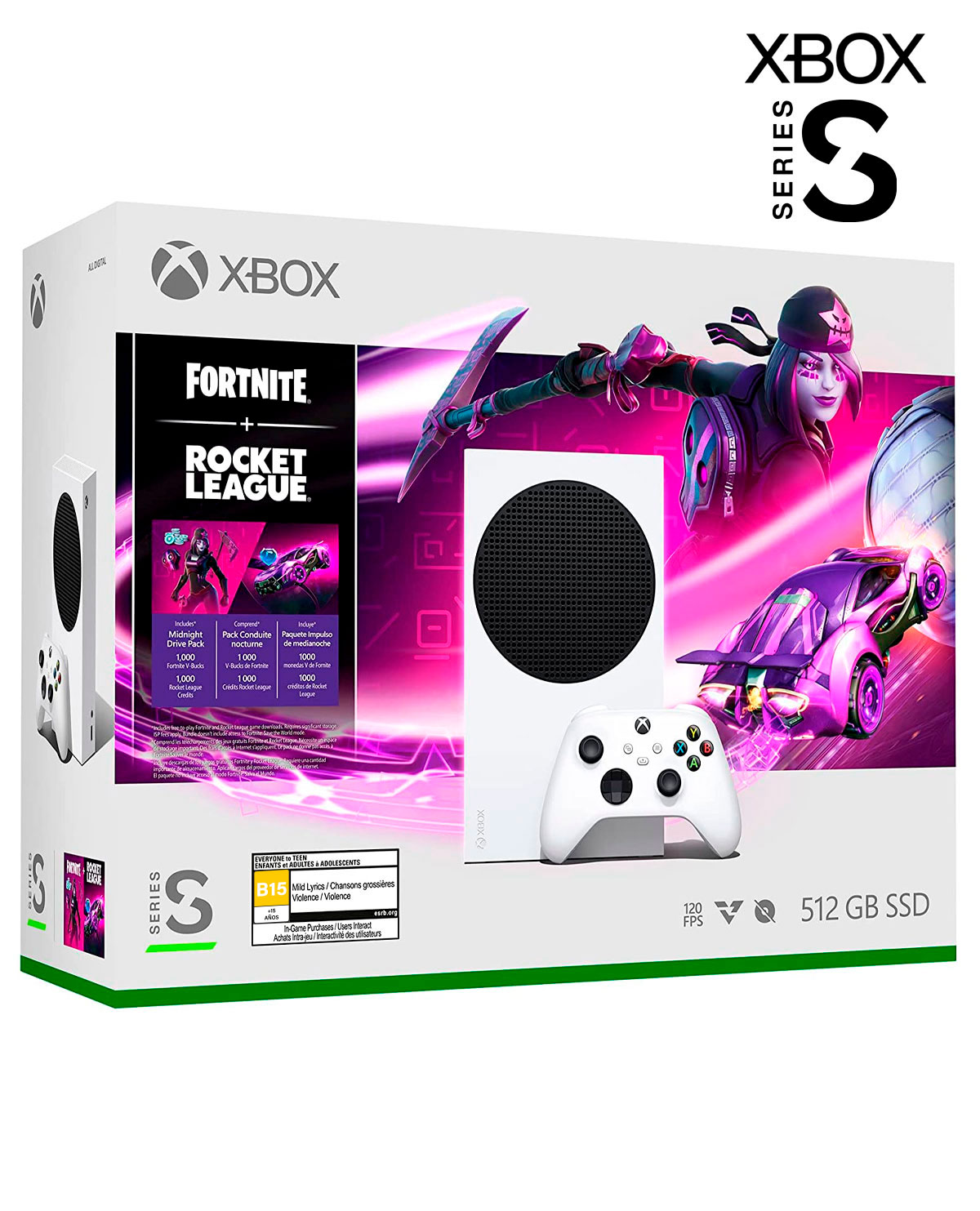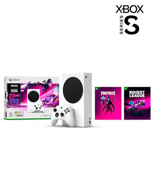 Obtén el paquete completamente digital de Fortnite y Rocket League para Xbox Series S que cuenta con un paquete Midnight Drive, 1000 monedas V y 1000 créditos de Rocket League.