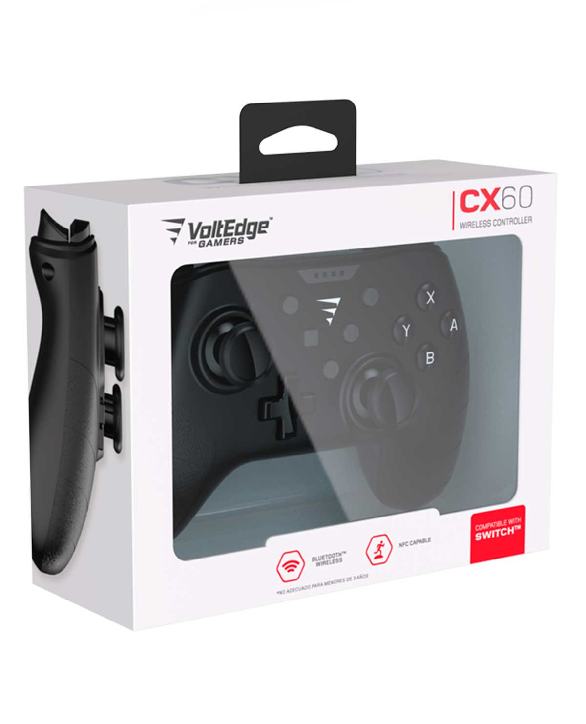 VoltEdge CX60 es un control inalámbrico de alta calidad diseñado para su uso con la consola Nintendo Switch. Tiene un diseño ergonómico y una carcasa negra que lo hacen atractivo visualmente.