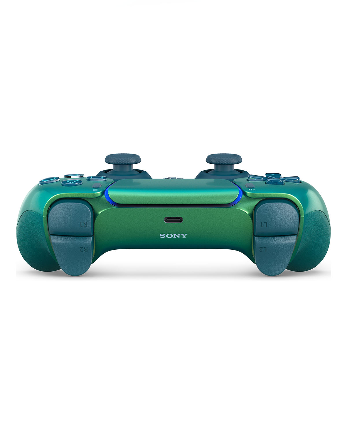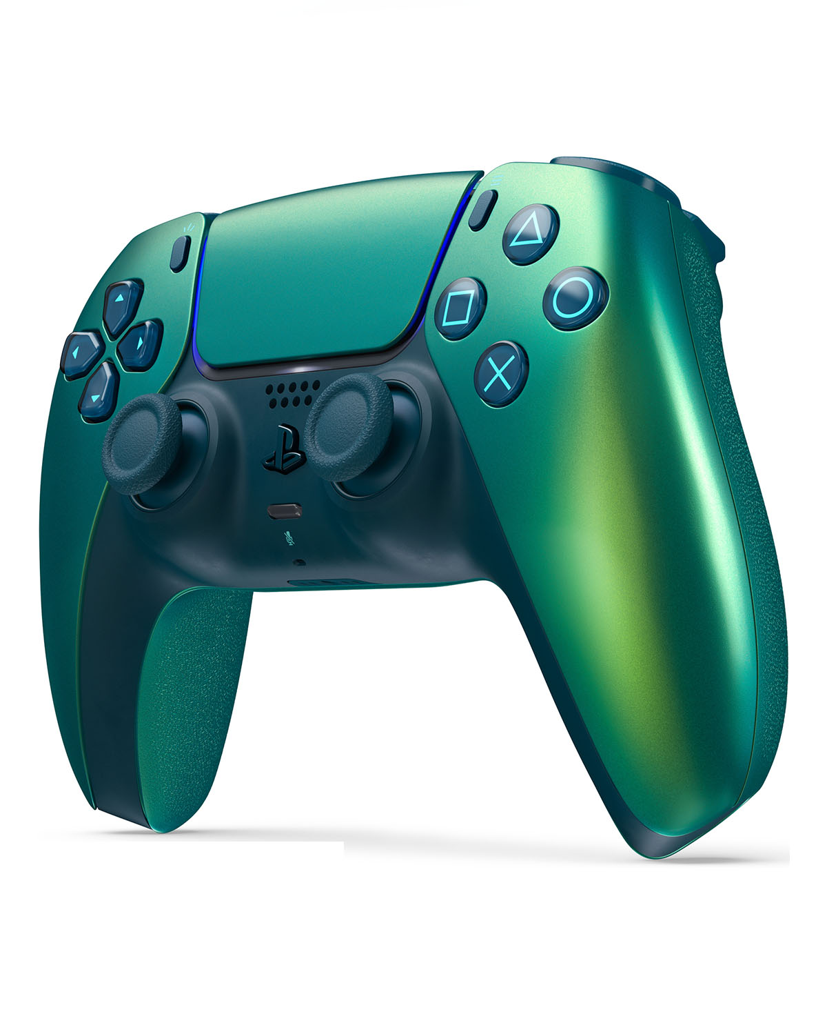 El control inalámbrico DualSense® Chroma Teal es una adición vibrante a la gama de accesorios de PlayStation®5, con un acabado en tonos verdes que cambia según el ángulo de visión.