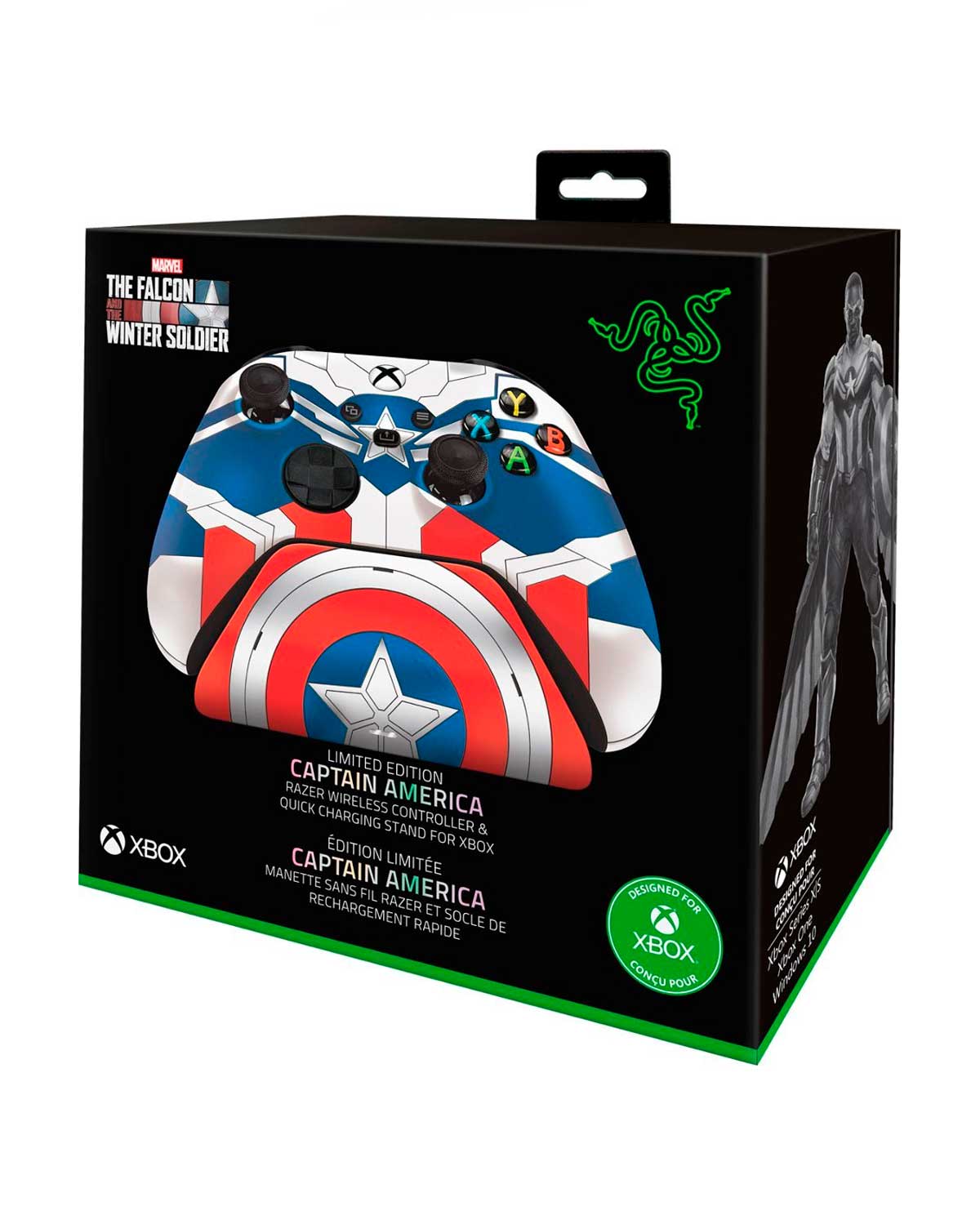 ¿Estás listo para tomar el mando? Empuña este símbolo de libertad con la edición limitada con licencia oficial de Marvel Studios The Falcon and the Winter Soldier, el control Xbox y el soporte de carga inspirados en el nuevo Capitán América.
