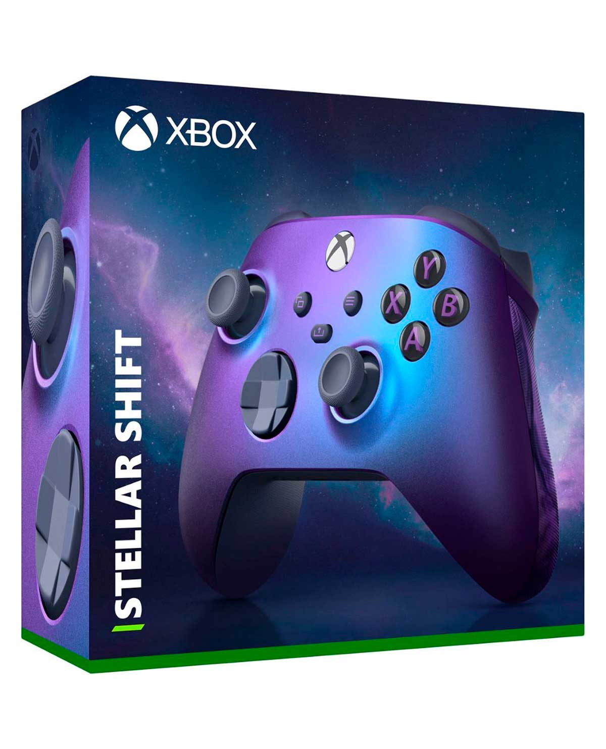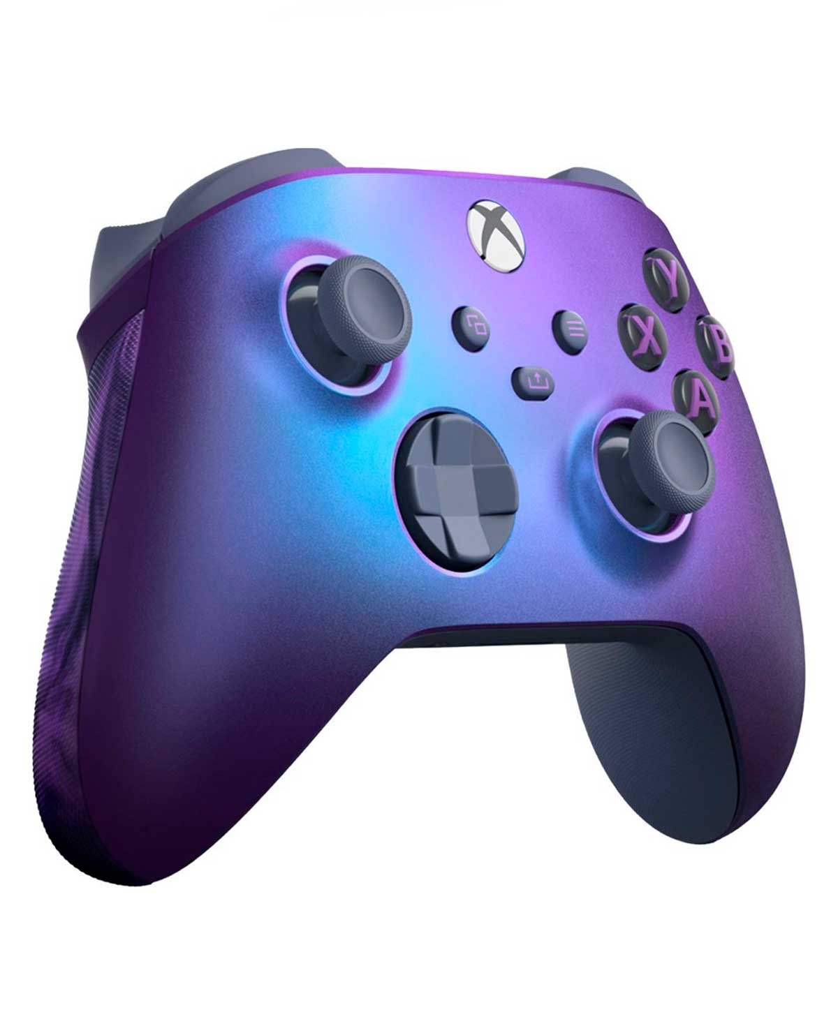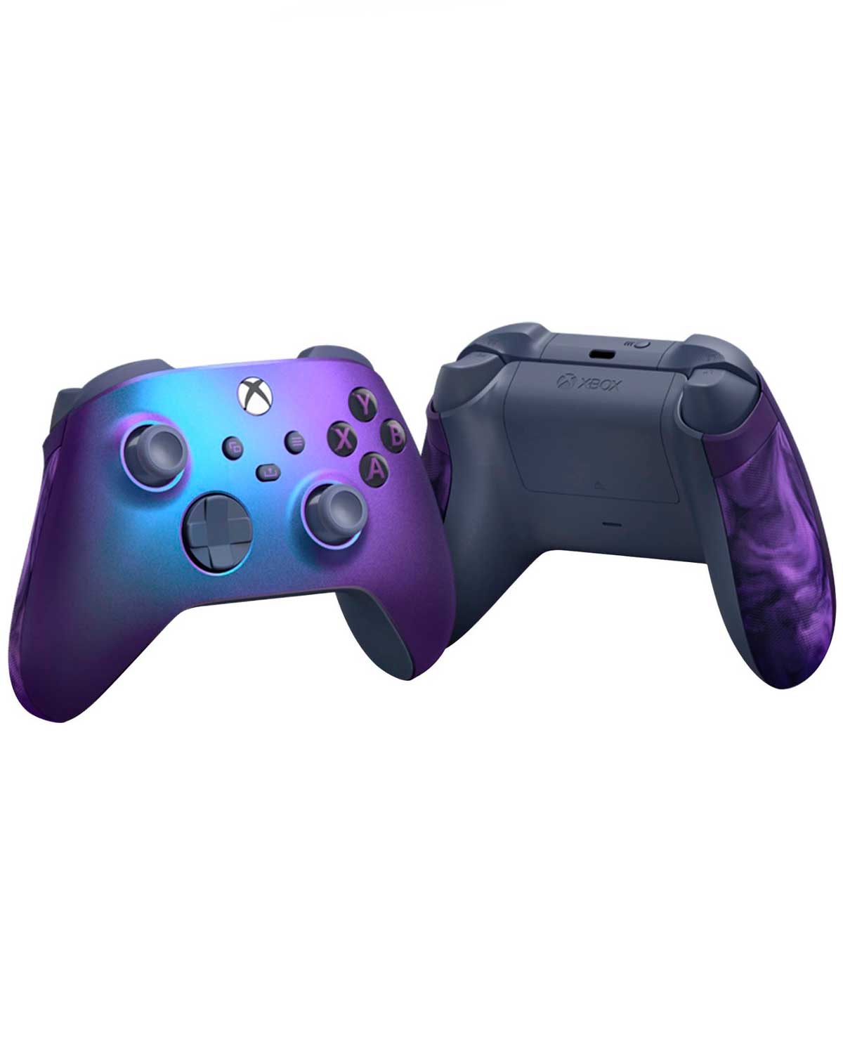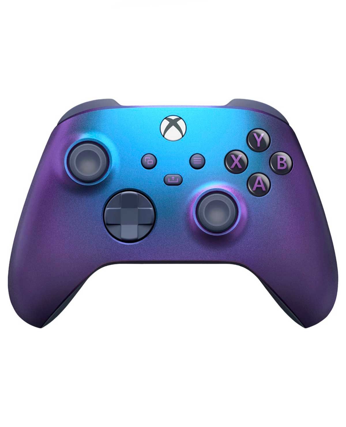 Desata el surrealismo con el Control inalámbrico Xbox: Edición especial Stellar Shift, con pad direccional híbrido que incluye agarres con remolinos y centelleo azules-violeta que cambian de color, así como agarres texturizados con remolinos violeta.