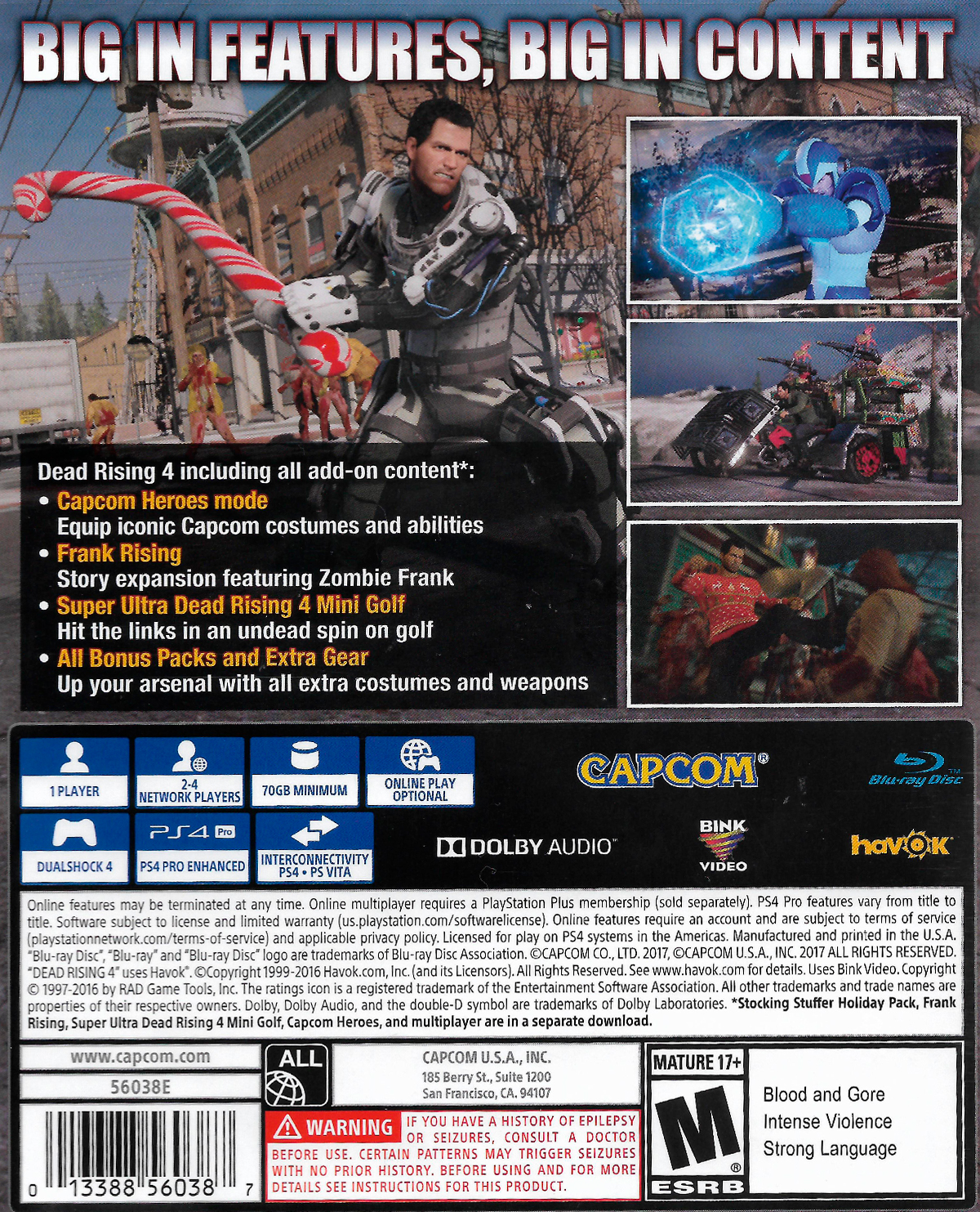 Además de todos los DLC publicados en PC y Xbox One, esta versión de Dead Rising 4 incluye un nuevo modo de juego llamado Capcom Heroes que permite a Frank West desbloquear armas y vestimentas inspiradas en algunos de los personajes más conocidos de Capcom.