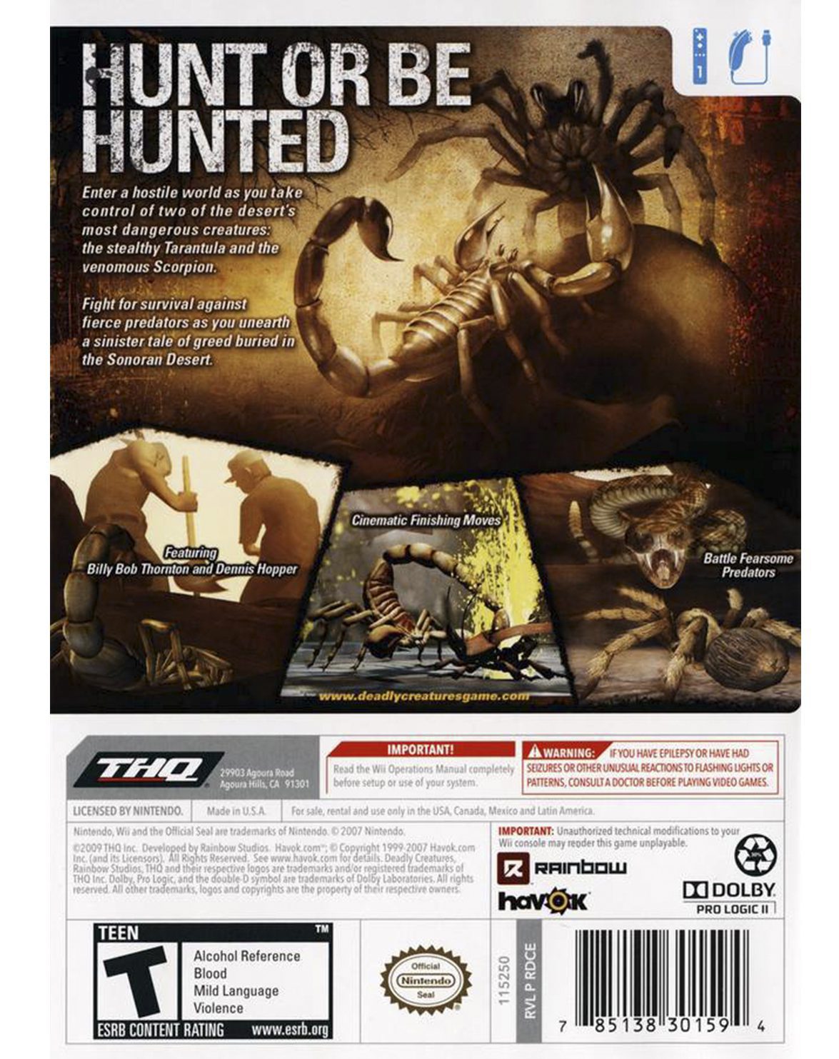 Deadly Creatures debuta en exclusiva para Wii, cuyo flexible sistema de manejo te permite explorar, atacar y conquistar con suma facilidad. El escorpión es un poderoso asesino que utiliza una serie de golpes tácticos para paralizar al enemigo, mientras que el arma secreta de la tarántula es el factor sorpresa: ¡Salta sobre tus enemigos desde gran distancia y termina el ataque mortal mordiendo a tu víctima y atrapándola en una telaraña!