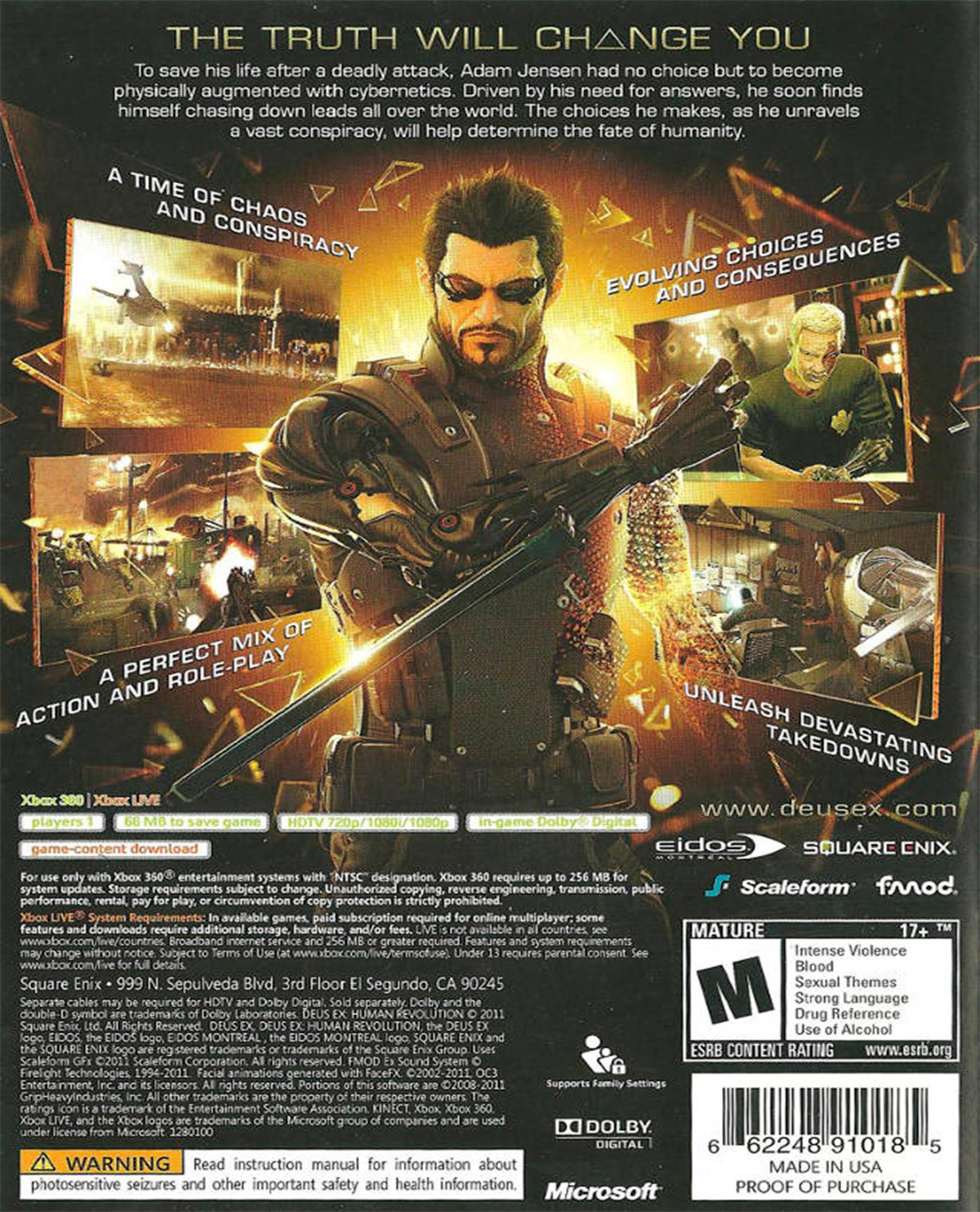 Siendo el primer capítulo, cronológicamente hablando, de la serie originaria de PC llamada Deus Ex, Human Revolution es toda una experiencia en términos de sistema de juego, y narrativa con temas de serio debate filosófico. En esta entrada, tomas control de Adam Jensen, quien funge como guardia de seguridad de Industrias Sarif, una de las más importantes empresas de aumentación bio-mecánica. Durante un ataque a los laboratorios, Adam es seriamente herido y forzado a pasar por una operación que le dará un brazo bio-mecánico, y con él una plétora de habilidades. Es aquí, en el pleno de una conspiración internacional, que comienza el juego.