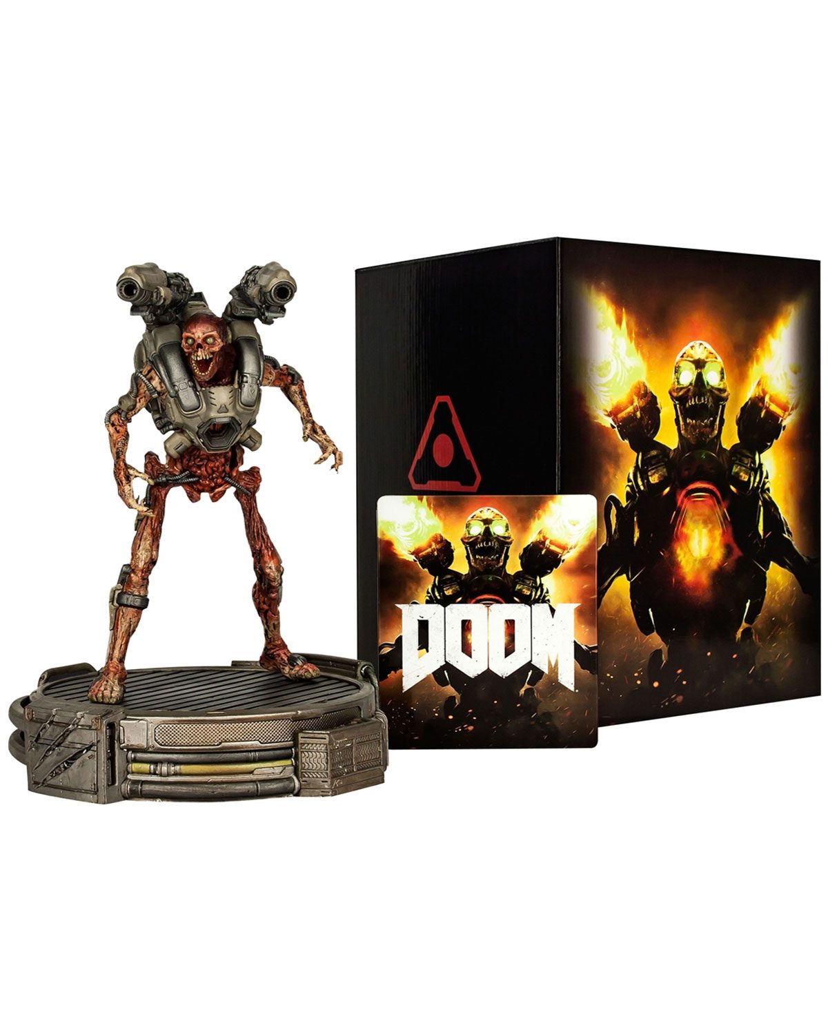 Creada en colaboración con TriForce, la edición de coleccionista de DOOM incluye una estatua exclusiva de 30 centímetros de alto que representa con todo lujo de detalles uno de los demonios más emblemáticos del juego: el revenant. Hecho con PVC de gran calidad y modelado a partir de los diseños 3D del juego, el revenant se sostiene sobre una base iluminada por LED con una turbina giratoria de la instalación de la UAC en Marte. La edición de coleccionista de DOOM también incluye una copia de este esperadísimo juego presentada en un exclusivo estuche de metal.
