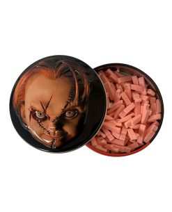 Una delicia diabólica para los fanáticos del terror clásico. Estos dulces vienen en una lata coleccionable inspirada en el infame muñeco Chucky, estrella de la saga “Child’s Play”.
