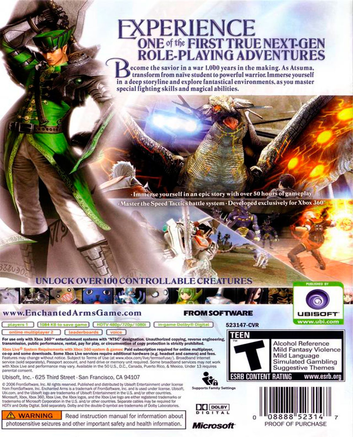 De manos de Ubisoft llega el primer RPG a la consola, con una historia intrigante y efectos extremadamente vividos, Enchanted Arms, aunque su vida es un poco ajetreada, Atsuma no se siente triste, pues tiene a sus amigos Makoto y Toya, con quienes estudia el antiguo arte de la magia y todos sus secretos, su artefacto mágico favorito es un pequeño Golem, el cual es un objeto animado por el deseo de su propietario, estos mismos trajeron una guerra hace mil años, donde cientos de vidas inocentes se perdieron y el uso de la magia fue prohibido durante un tiempo; uno de los perversos golems de aquella época, la reina del hielo, a despertado y esta intentando desesperadamente volver a provocar esta guerra.
