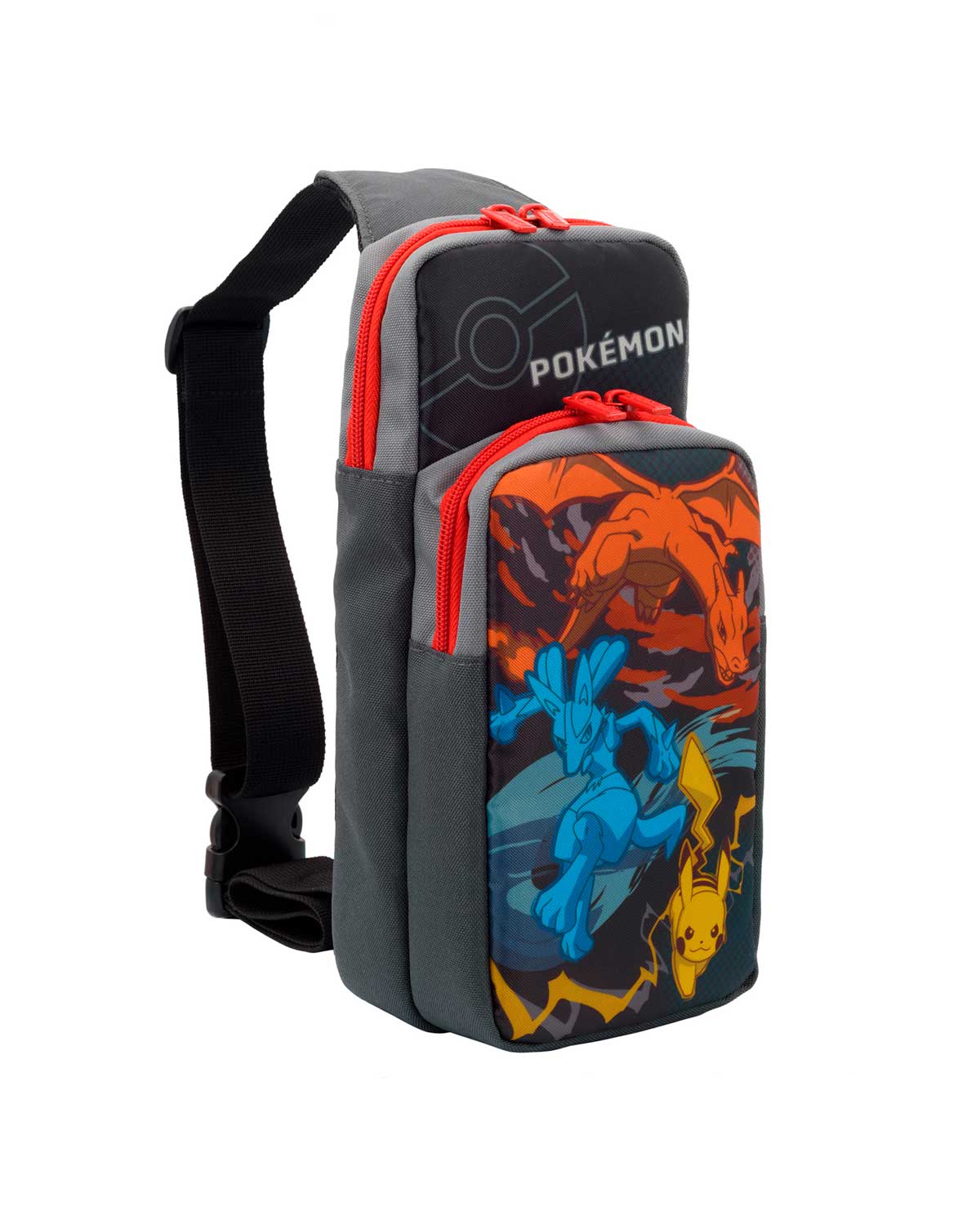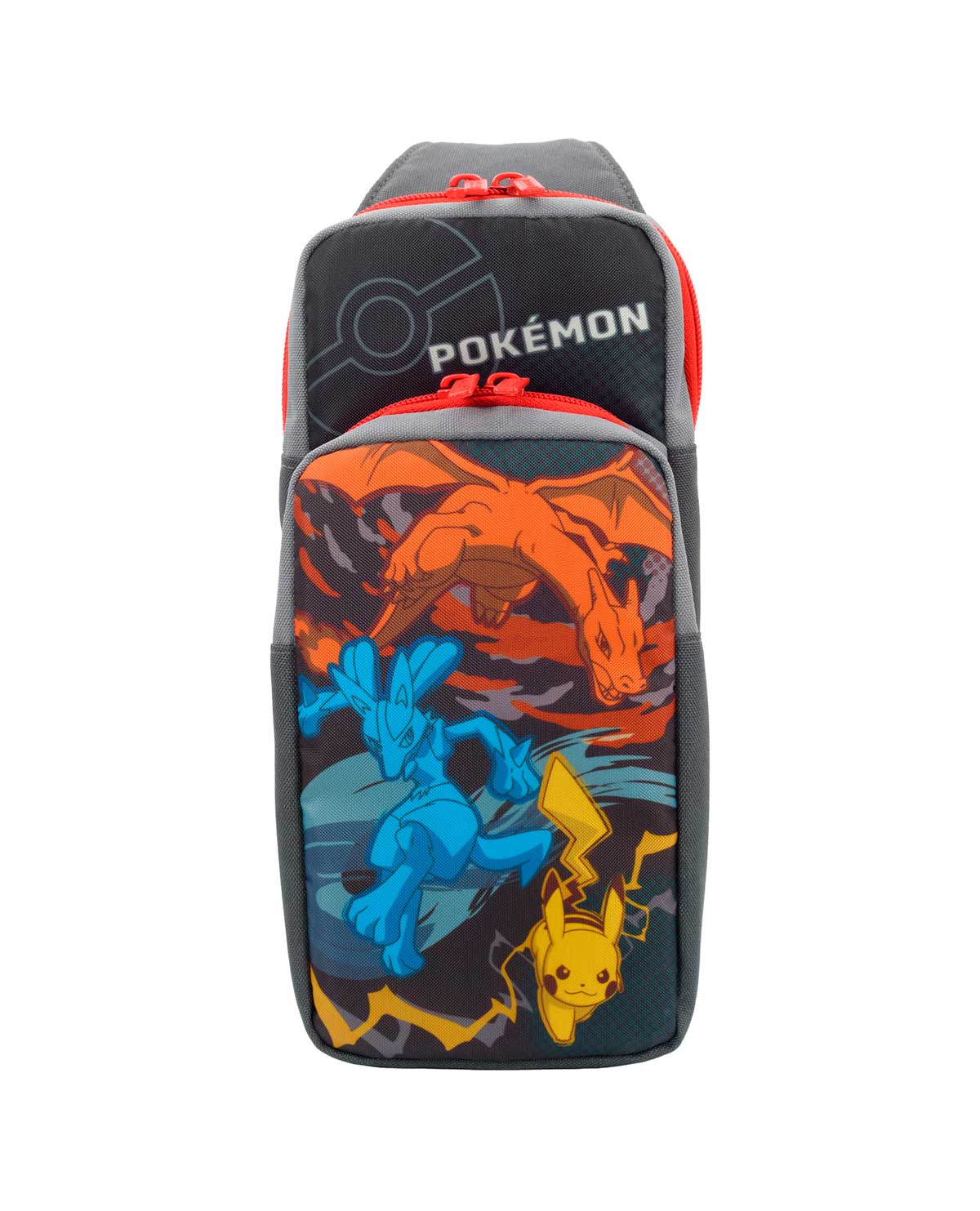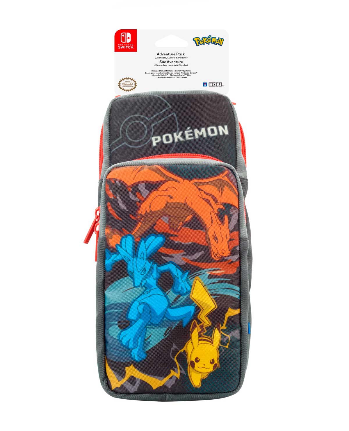 Su sistema Nintendo Switch, la base, el cargador y otros accesorios encajan perfectamente y de forma segura dentro del Paquete Aventura. Este atrevido y elegante diseño de Pokémon con Pikachu, Charizard y Lucario te diferenciará del resto.