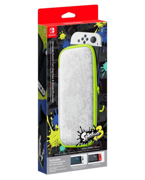 ¿Qué es azul, amarillo y salpicado por todas partes? ¡Por supuesto que el estuche de transporte y el protector de pantalla de Nintendo Switch Splatoon 3!