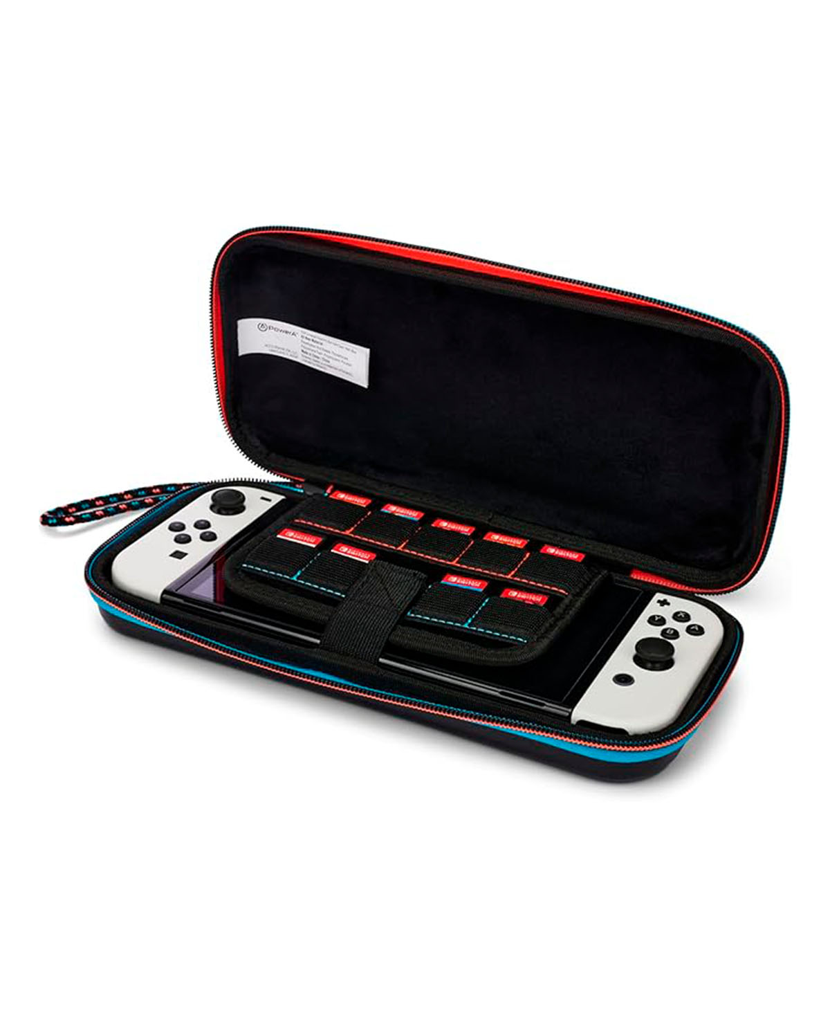 La solapa acolchada no solo protege la pantalla, sino que también ofrece almacenamiento para hasta nueve tarjetas de juego, manteniendo tus títulos favoritos siempre a la mano.