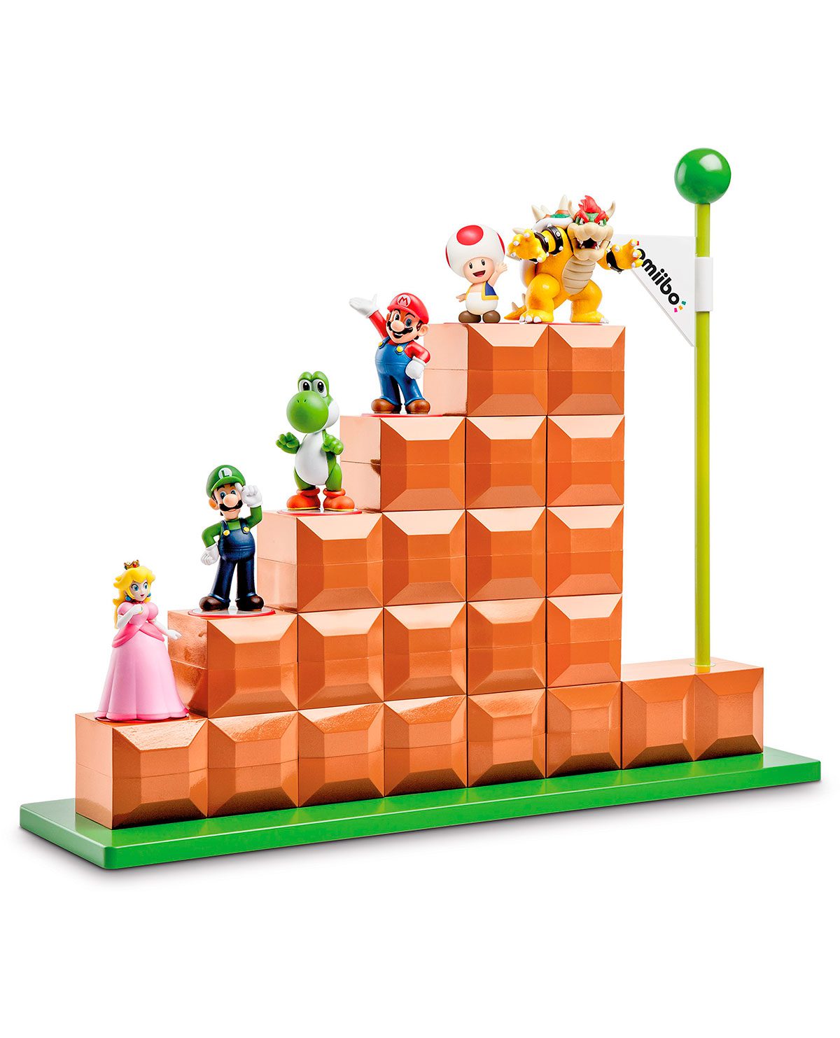Para que tengas una forma divertida en donde exhibir a tus personajes favoritos de Amiibo*, llega el End Level Display que nos regresa a la época de los 8-bits. Representado el característico final del nivel 1-1 de la saga de Super Mario Bros.