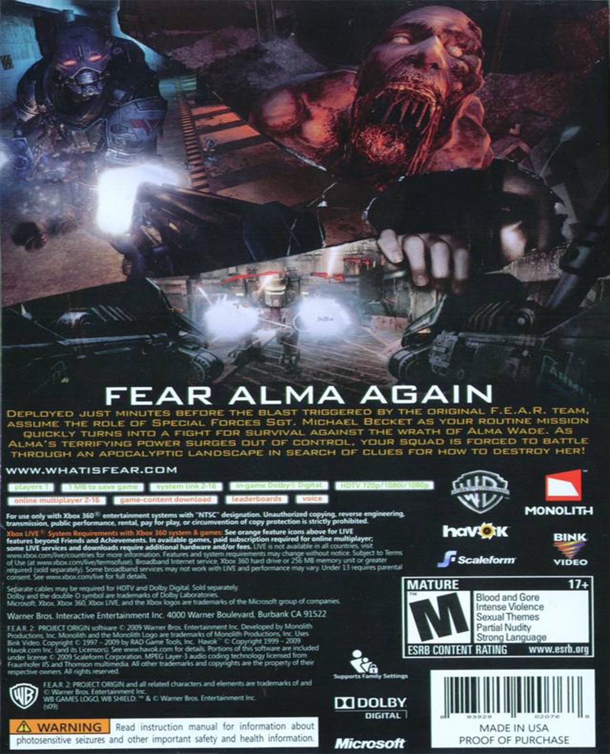 Secuela de F.E.A.R., el interesante juego de acción de Monolith Productions que en este caso nos pondrá en la piel de Michael Beckett, un soldado del grupo de operaciones especiales Delta, que deberá enfrentarse a todo tipo de sucesos paranormales.