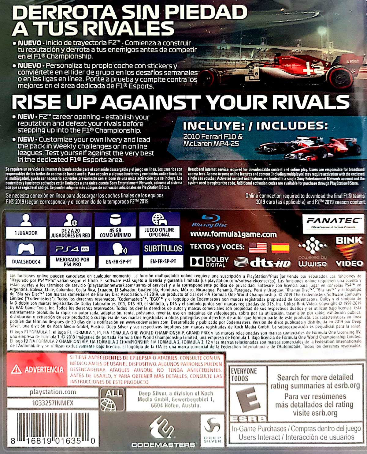 F1® 2019 incluye todos los equipos, pilotos y los 21 circuitos oficiales de la temporada 2019. Este año el juego incluye la F2™, que permite participar en la temporada 2018 con pilotos como George Russell, Lando Norris y Alexander Albon.