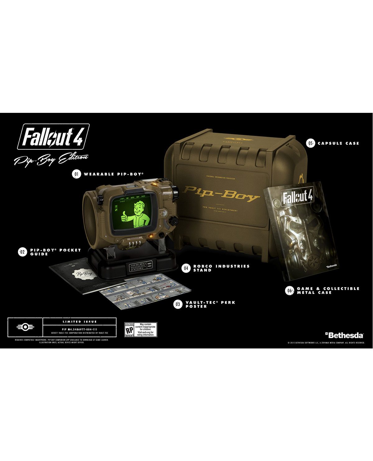 • Replica de Pip-Boy, una base y una Capsule Case que puedes usar, esta herramienta recrea fielmente al modelo dentro del juego e incluye una base de RobCo Industries, Esta cápsula tiene luces, se ajusta y rota para ser compatible con una variedad de Smartphones que permite a los jugadores tener un control completo por medio de la App oficial de Pip-Boy companion con la que pueden tener control completo de sus items, holo tapes y mucho más
