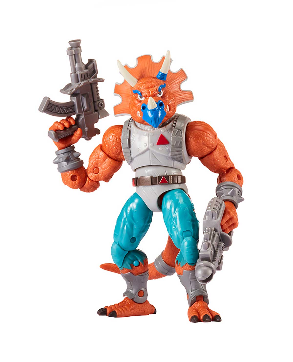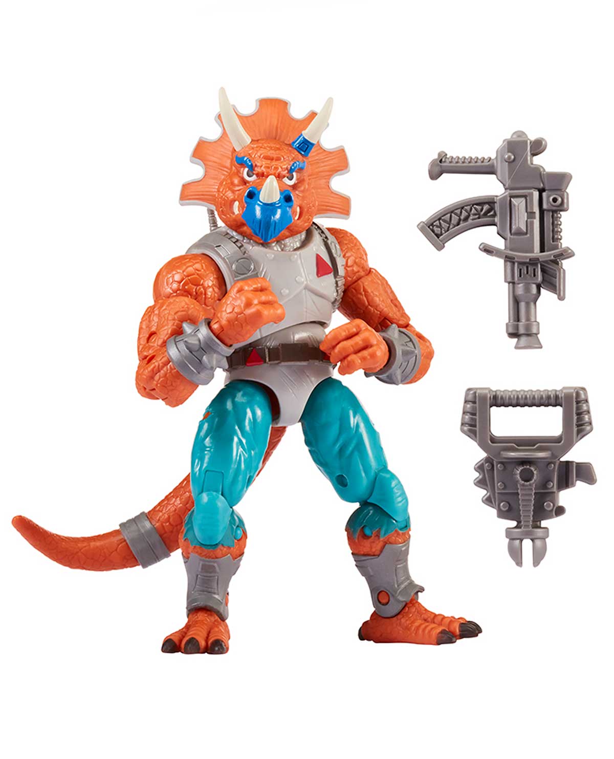 Esta figura de Triceraton tiene 18 puntos de articulación para replicar una realista batalla de acción. Los accesorios incluyen sus dos poderosas armas bláster.