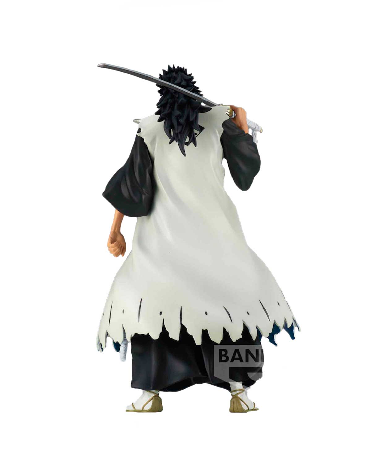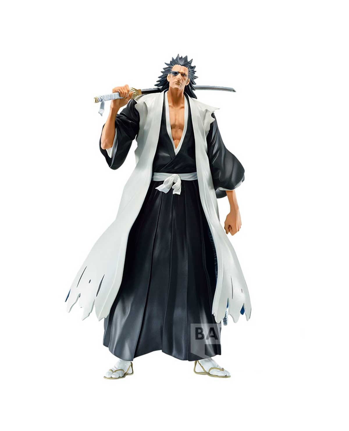 La figura muestra a Zaraki en una pose dinámica y detallada, en su uniforme roto característico de la Sociedad de Almas. La escultura presenta una gran atención al detalle, con una textura detallada en la ropa, el cabello y la espada del personaje.