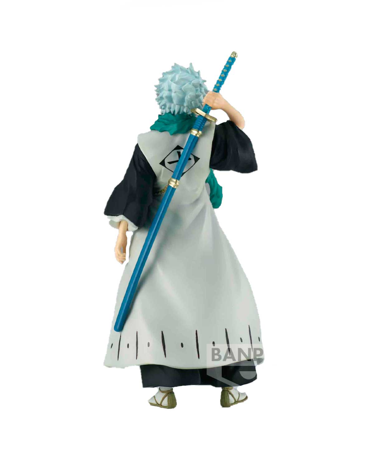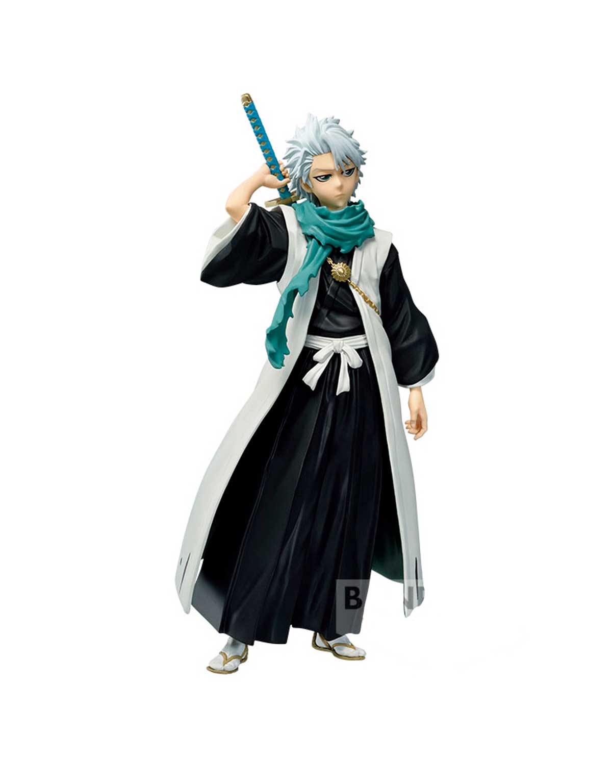 La figura muestra a Toshiro en una pose dinámica y detallada, en su uniforme característico de la Sociedad de Almas. La escultura presenta una gran atención al detalle, con una textura detallada en la ropa, el cabello y la espada del personaje.