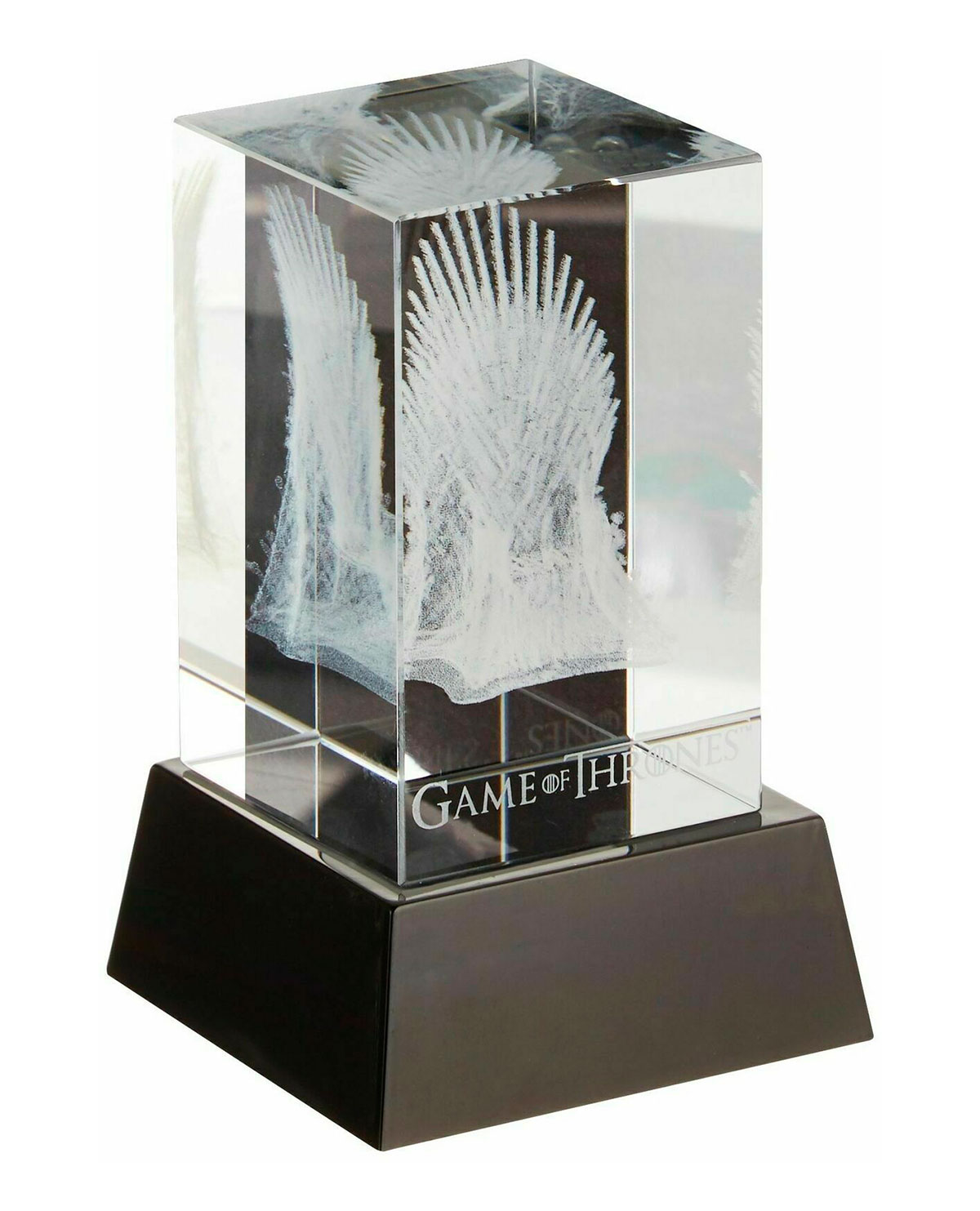 ¡Una luz dorada de otro mundo ilumina las delicadas espadas grabadas con láser del icónico Iron Throne de la serie Game of Thrones!