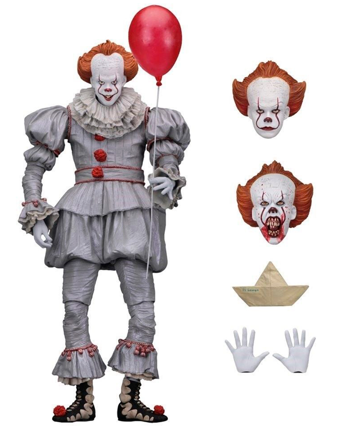 El payaso más temible en la historia de la película de terror It ha llegado con una terrorífica figura. Esta figura hecha de de un resistente plásticos mide aproximadamente 18 cm, cada detalle del traje y rostro son tan perfectos que te aseguramos que no podrás dormir en la noche por temor a que venga por ti, viene con dos caras intercambiables, un barco de papel y un globo rojo. Si eres fan de las cintas de terros, sin duda esta figura debe estar en tu colección.