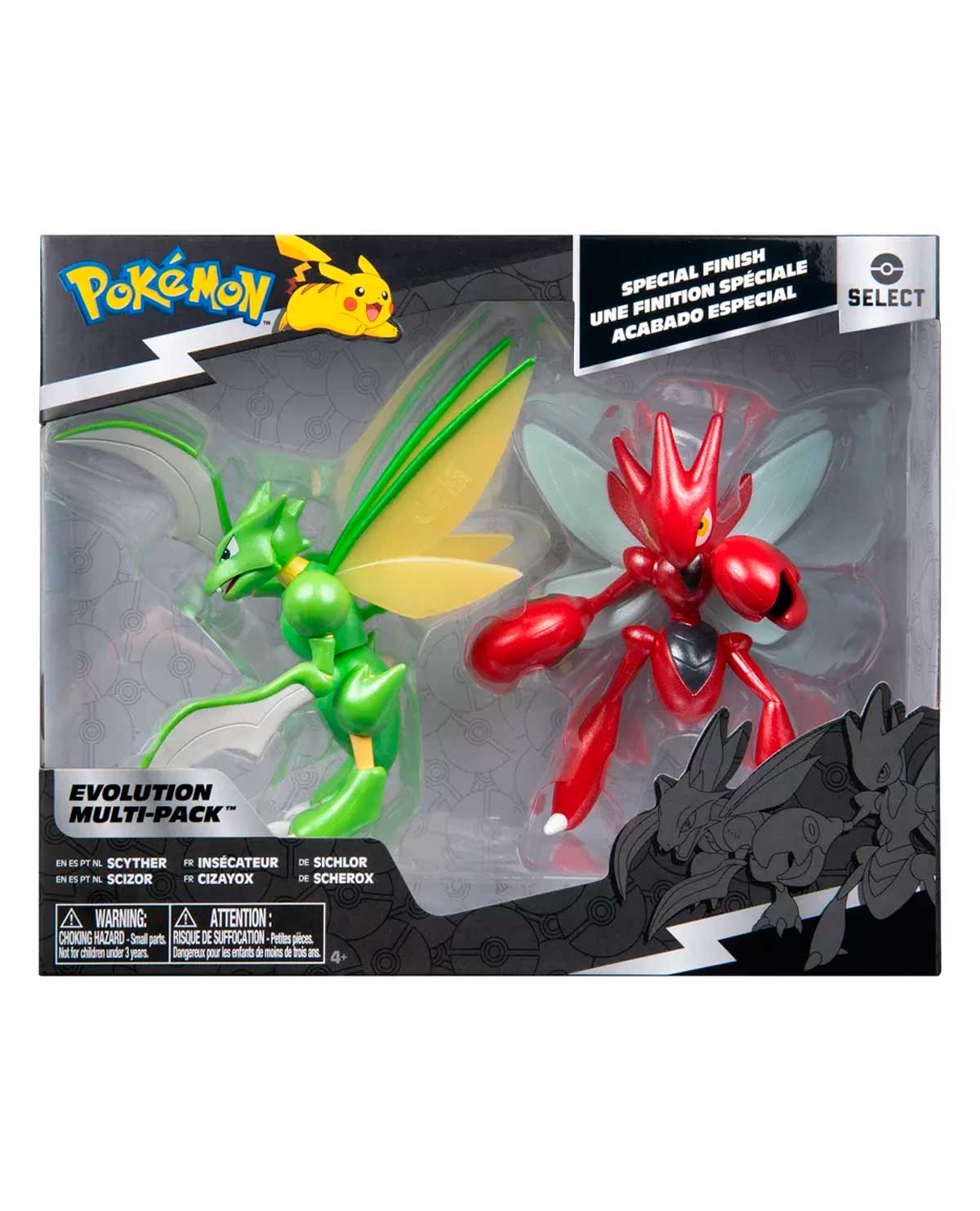 El paquete incluye a Scyther y Scizor. Todos tienen detalles auténticos y parecen sacados directamente de la serie animada Pokémon.