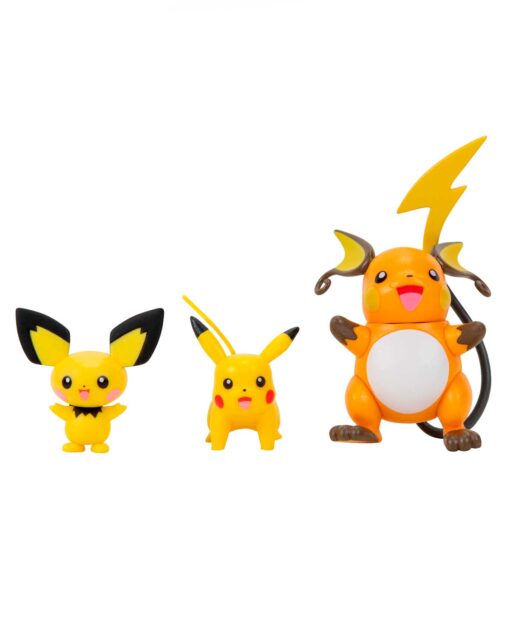 El paquete incluye a Pichu, Pikachu y Raichu. Todos tienen detalles auténticos y parecen sacados directamente de la serie animada Pokémon.