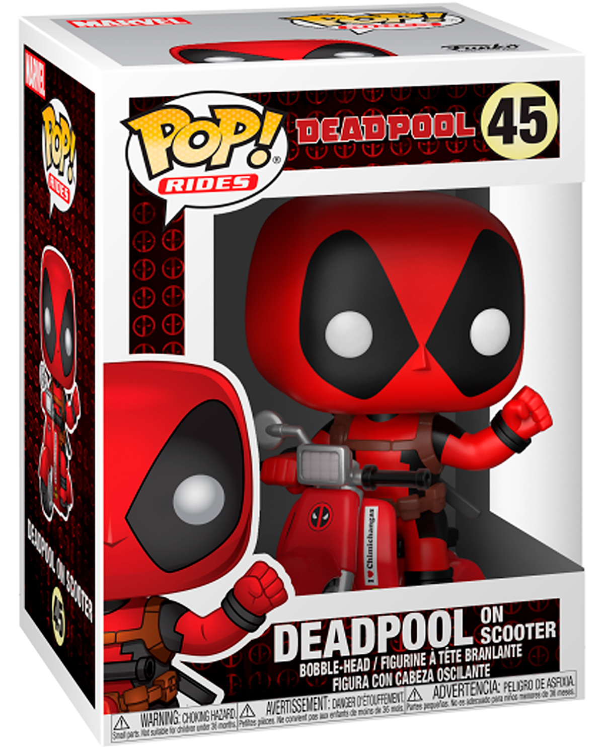 En esta ocasión Funko nos ha regalado su versión Pop del héroe más extrovertido de Marvel, el genial Deadpool, con su traje y máscara rojos característicos pero esta vez acompañado de su motoneta, listo para provocar estragos en la ciudad.