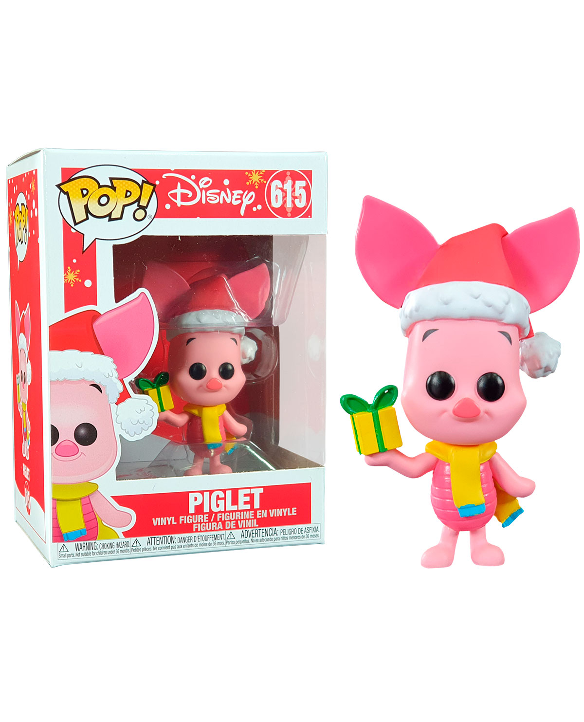 Este Pop presenta a Piglet con un outfit muy navideño: Una bufanda, un gorro de santa y un regalo.