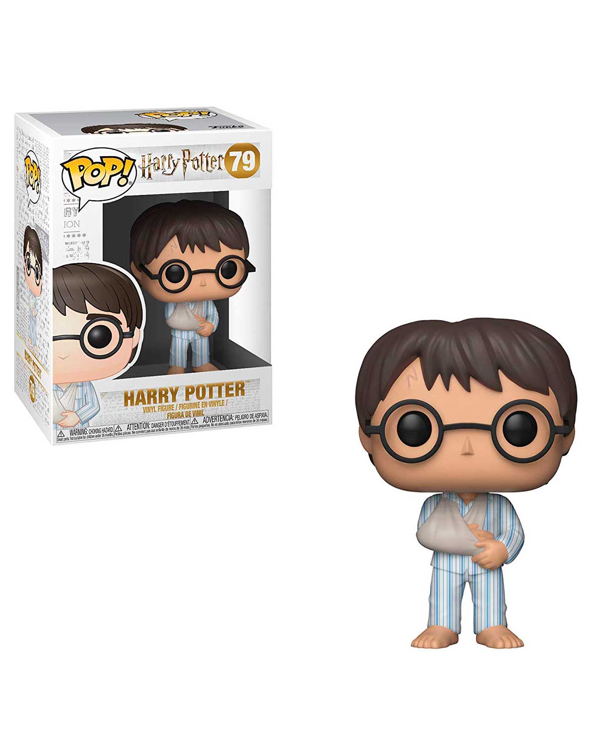 Esta figura Funko Pop presenta a Harry Potter vistiendo su pijama y con su brazo enyesado después de caerse de su escoba.