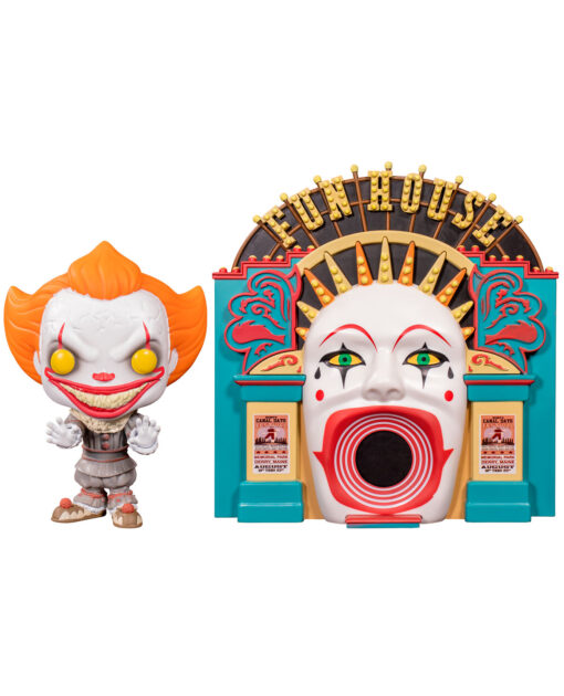 Este conjunto de figuras Pop incluye al malévolo Pennywise con una sonrisa demoníaca junto a la casa de la diversión.