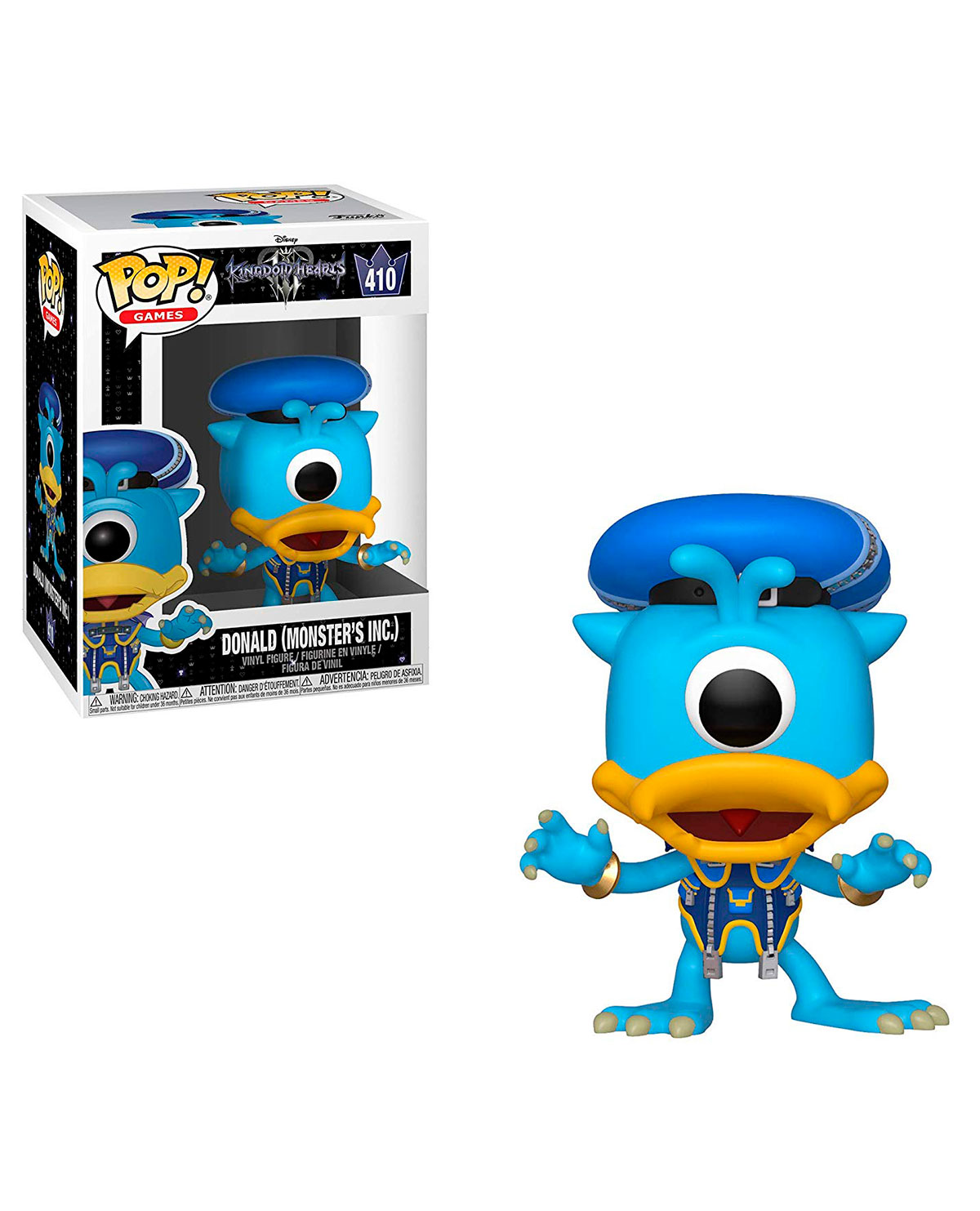 Este pop presenta a Donald en su forma monstruosa como aparece cuando viaja a través del mundo de Monster’s Inc en el juego. Tiene un solo ojo en su cabeza y un cuerpo azul.