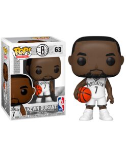Este Pop presenta a Kevin Durant de los Nets de Brooklyn. Él porta el uniforme del equipo mientras sostiene un balón de baloncesto.